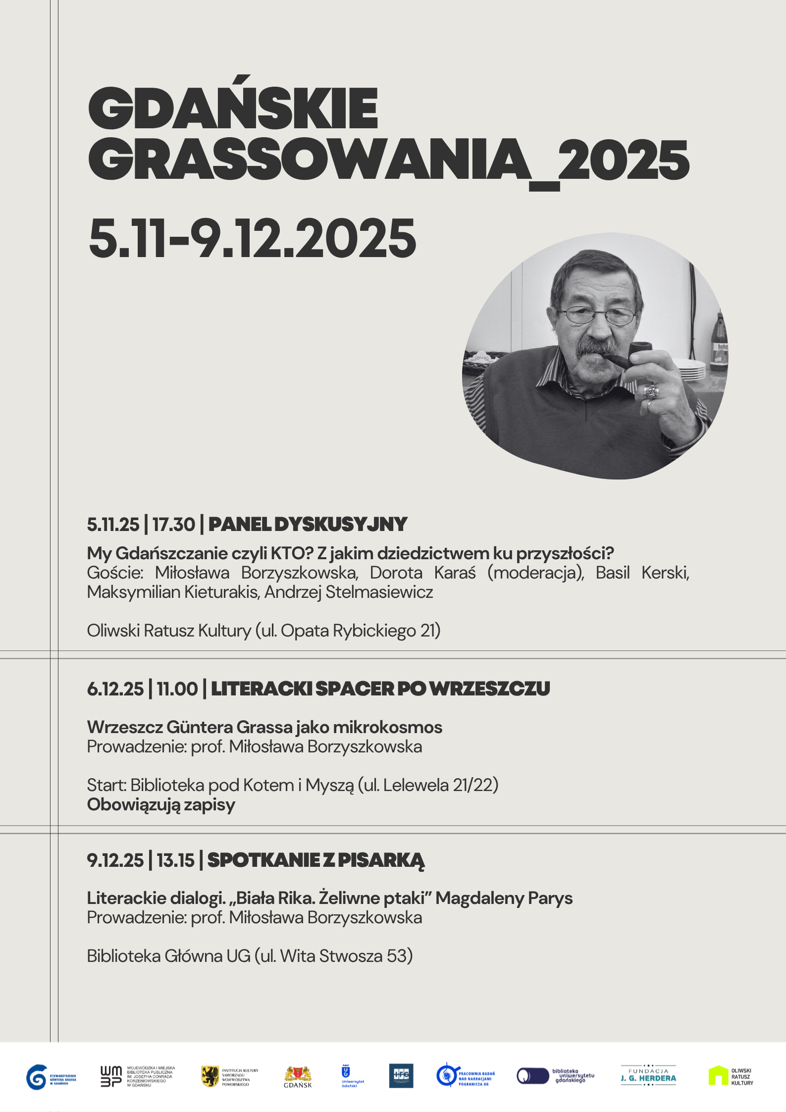 Zapraszamy na 98. urodziny Güntera Grassa, laureata Literackiej Nagrody Nobla, honorowego obywatela Miasta Gdańska i doktora honoris causa Uniwersytetu Gdańskiego. To pretekst i okazja przywołać imię i odczytać dzieło artysty w tak dynamicznie zmieniającej się rzeczywistości.